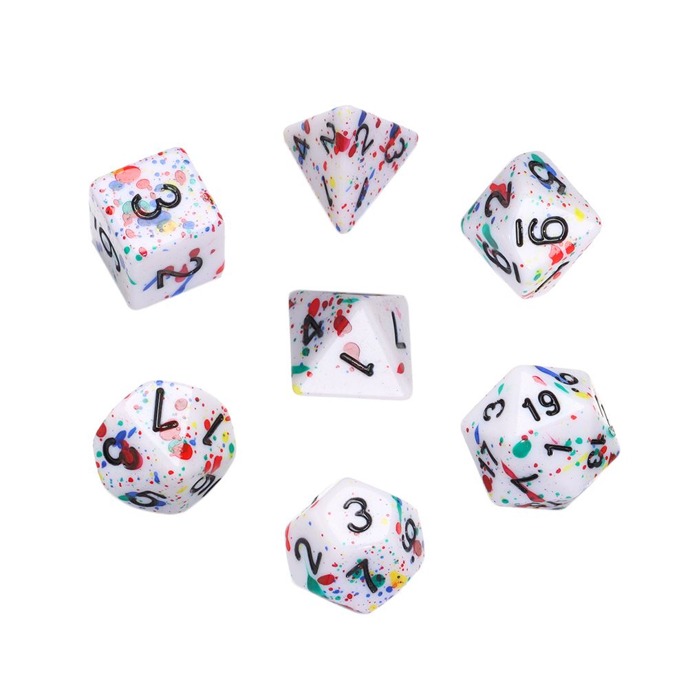 Roll your next NAT 20 wit this dice set featuring a color splatter design.